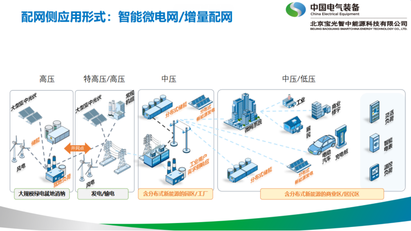 2.配網(wǎng)側(cè):主要面向園區(qū)、工廠、居民區(qū)及商業(yè)區(qū)等分布式場景,其特點是具有海量分散的負(fù)荷和被控對象,這與電源側(cè)集中式控制模式存在本質(zhì)差異。系統(tǒng)架構(gòu)基于公共通信網(wǎng)絡(luò)構(gòu)建,采用全新的控制策略來應(yīng)對分布式能源的復(fù)雜管理需求,重點解決智慧能源監(jiān)控、虛擬電廠協(xié)調(diào)控制、智能運維及智能配電等核心問題。該解決方案與增量配網(wǎng)和虛擬電廠深度結(jié)合,其功能架構(gòu)同樣包含監(jiān)控、優(yōu)化控制和運維等模塊,但針對配網(wǎng)特性進行了專門設(shè)計。通過分布式控制算法和邊緣計算技術(shù),實現(xiàn)對海量分布式資源的精準(zhǔn)管控,形成與電源側(cè)集中式管理相互補充的完整能源管理體系,為配網(wǎng)側(cè)的清潔能源高效利用提供技術(shù)支撐。