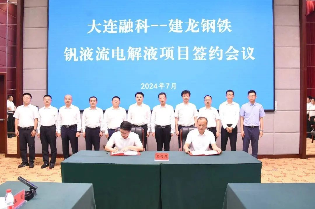 2024年7月13日,大連融科儲(chǔ)能集團(tuán)股份有限公司和黑龍江建龍鋼鐵有限公司在雙鴨山市迎賓館舉行釩液流電解液項(xiàng)目簽約會(huì)議。會(huì)上經(jīng)過(guò)兩家公司友好協(xié)商,最終達(dá)成一致,共同出資設(shè)立黑龍江融祥儲(chǔ)能科技有限公司,助力雙鴨山“全釩液流電池電解液”產(chǎn)業(yè)發(fā)展,并簽訂了釩液流電解液項(xiàng)目合作協(xié)議。