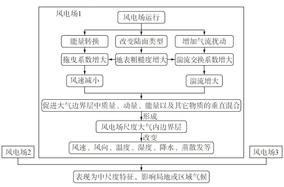 風(fēng)電機(jī)組運(yùn)行過程中,其旋轉(zhuǎn)吸收風(fēng)能的同時(shí),增加了區(qū)域內(nèi)地表粗糙度,并對(duì)氣流增加了擾動(dòng)作用,表現(xiàn)出“低風(fēng)速、高湍流”的尾流效應(yīng),促進(jìn)大氣邊界層中質(zhì)量、動(dòng)量、能量以及其它物質(zhì)的垂直混合。經(jīng)過若干風(fēng)電機(jī)組群的尾流疊加效應(yīng),即形成風(fēng)電場尺度的大氣內(nèi)邊界層,當(dāng)其充分發(fā)展時(shí),可對(duì)風(fēng)電場下游幾十公里范圍內(nèi)產(chǎn)生干擾作用。尾流效應(yīng)的量級(jí)和距離受風(fēng)電場的大小影響的同時(shí),還和大氣邊界層的穩(wěn)定性有關(guān)。研究表明,在大氣中性層結(jié)條件下,風(fēng)電場尾流距離可以表示為風(fēng)電機(jī)組直徑、高度、行數(shù)、列間距、動(dòng)能利用系數(shù)和地表粗糙度的函數(shù)。隨著大規(guī)模風(fēng)電基地的開發(fā),風(fēng)電場尾流效應(yīng)可呈現(xiàn)出中尺度特征,影響局地或區(qū)域大氣物理過程,進(jìn)而產(chǎn)生局地或區(qū)域氣候效應(yīng),影響機(jī)理如下圖所示: