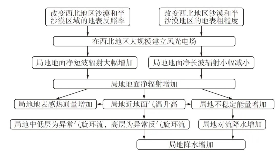 在我國西北干旱和半干旱地區(qū)風(fēng)電場和光伏電站建設(shè)的氣候效應(yīng)研究中,西北地區(qū)大規(guī)模風(fēng)電場和光伏電站的建設(shè)導(dǎo)致局地地面凈短波輻射增加,地表感熱通量升高,近地面氣溫升高,使新疆西部地區(qū)、河西走廊地區(qū)和我國黃淮等地降水量增加,而華北部分地區(qū)降水減少。反照率的改變導(dǎo)致低層形成氣旋性環(huán)流,使我國中部地區(qū)出現(xiàn)南風(fēng)異常,西北地區(qū)產(chǎn)生東風(fēng)異常,高層形成反氣旋環(huán)流,可以影響我國大部分地區(qū),過程機(jī)理如下圖所示。此外,研究還進(jìn)一步指出,太陽能利用導(dǎo)致的氣候效應(yīng)大于風(fēng)能利用的氣候效應(yīng)。