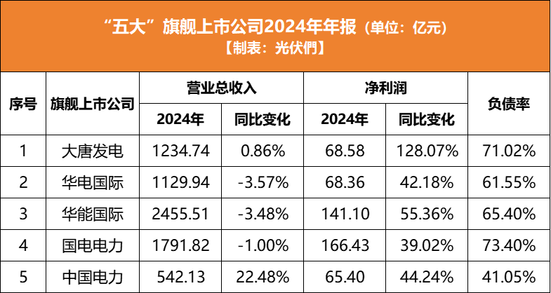 中國儲能網(wǎng)訊:截至本周,“五大發(fā)電集團”旗艦上市公司的2024年財報均已披露完成。光伏們從營業(yè)總收入、凈利潤、負債率三個維度統(tǒng)計5家上市企業(yè)2024年經(jīng)營數(shù)據(jù),如下: