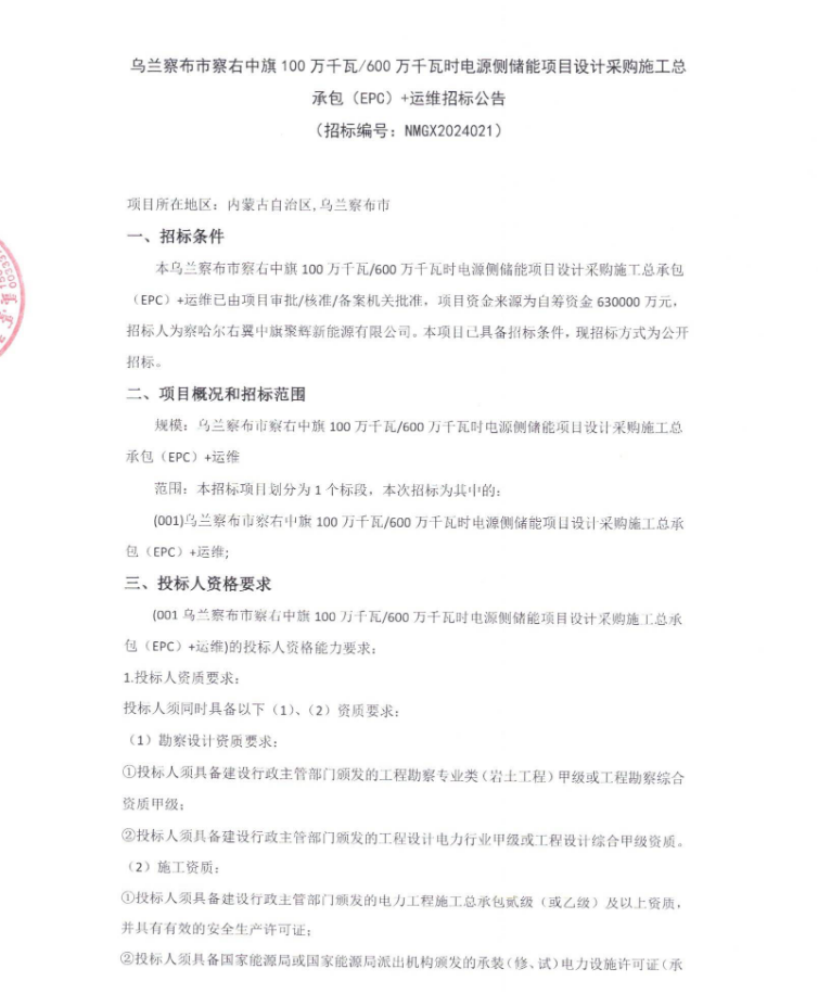 中國(guó)儲(chǔ)能網(wǎng)訊:4月21日,察哈爾右翼中旗聚輝新能源有限公司發(fā)布烏蘭察布市察右中旗1GW/6GWh電源側(cè)儲(chǔ)能項(xiàng)目設(shè)計(jì)采購(gòu)施工總承包(EPC)+運(yùn)維招標(biāo)公告。資金來(lái)源為自籌資金63億元,折合單價(jià)1.05元/Wh。
