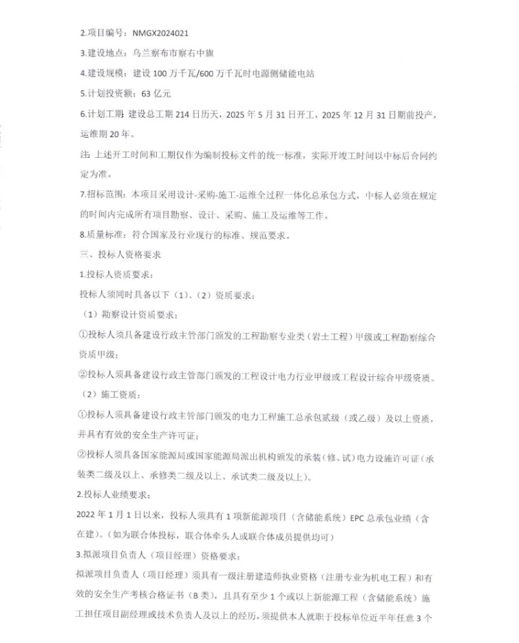 要求投標(biāo)人2022年1月1日以來(lái),須具有1項(xiàng)新能源項(xiàng)目(含儲(chǔ)能系統(tǒng))EPC總承包業(yè)績(jī)(含在建)(如為聯(lián)合體投標(biāo),聯(lián)合體牽頭人或聯(lián)合體成員提供均可)。