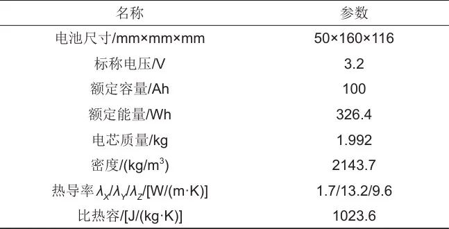 為了建立電池?zé)崮P停枰@取電池單體的熱物性參數(shù)。以方形磷酸鐵鋰(LFP)電池為對象,文中鋰電池的熱物性參數(shù)通過實驗獲得,根據(jù)文獻(xiàn)[17]的方法得到單體鋰電池各部分的相關(guān)參數(shù),電池基本參數(shù)如表1所示。
