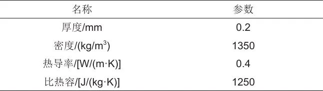 根據(jù)方形電池的對稱性,選擇電池的1/2對稱體積建立模型即可滿足仿真需要。簡化的電池組模型由2個半電池組成,電池大面相對放置,電池側(cè)面與剖面均設(shè)置為對稱表面。在低溫環(huán)境溫度下,本工作采用加熱膜在短時間內(nèi)將電池模組加熱至適宜的工作溫度,并確保電池組良好的溫度均勻性,便于后續(xù)的正常充放電行為。加熱膜的基本參數(shù)見表2。根據(jù)加熱膜排布位置,分別在電池大面、側(cè)面和底面上粘貼加熱膜,電池模型見圖1。利用穩(wěn)壓電源向加熱膜輸入電信號,加熱膜產(chǎn)生熱量通過熱傳導(dǎo)由電池外表面?zhèn)鬟f至低溫電芯,為電池模組迅速升溫。