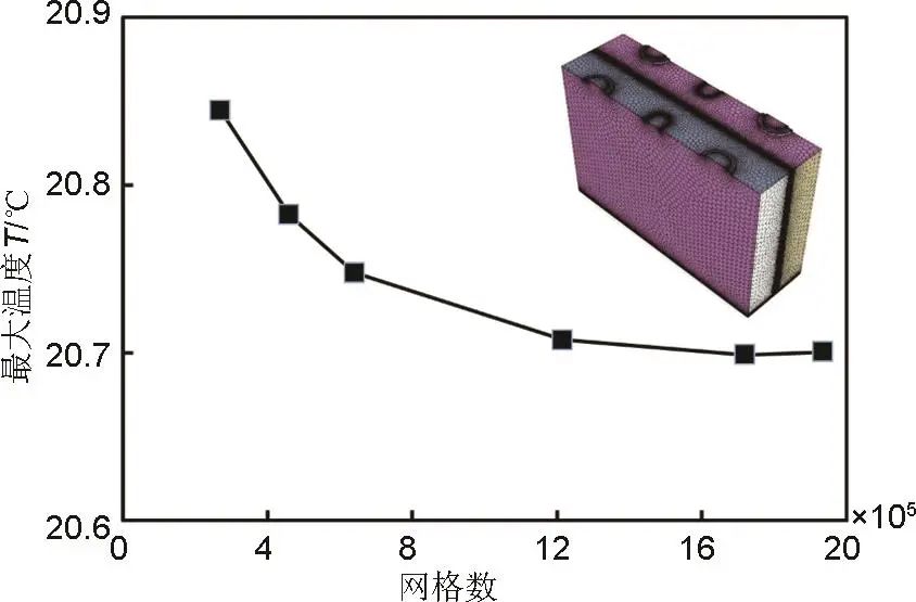 加密網(wǎng)格可以提高仿真計算的準(zhǔn)確性。網(wǎng)格尺寸過大會使計算失真,甚至導(dǎo)致結(jié)果發(fā)散;網(wǎng)格尺寸過小則會增加計算時間,浪費(fèi)計算資源。本研究針對電池模型劃分不同網(wǎng)格尺寸,分析了不同數(shù)量的網(wǎng)格對模型計算精度的影響。如圖2所示,當(dāng)網(wǎng)格數(shù)超過120萬時,電池最大溫度趨于平穩(wěn),因此確定網(wǎng)格模型共計4514415個節(jié)點(diǎn)、1229694個網(wǎng)格單元。