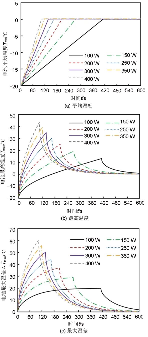 將加熱膜粘貼在電池大面,加熱膜分別輸入不同的電參數(shù),加熱功率從100 W增大到400 W,每組間隔50 W。初始溫度為-20 ℃,設(shè)定加熱膜的邊界條件為當(dāng)電池平均溫度到達(dá)0 ℃時,加熱膜加熱功率變?yōu)?,電池的溫升結(jié)果如圖3所示。