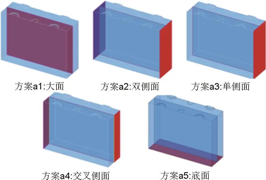 方形鋰電池的熱導(dǎo)率呈現(xiàn)各向異性,在電池的不同方向上使用同一功率加熱,會產(chǎn)生不同的加熱效果。本工作分別采取了5種布置方案(圖5)來加熱電池單體,并觀察電池溫度變化情況。