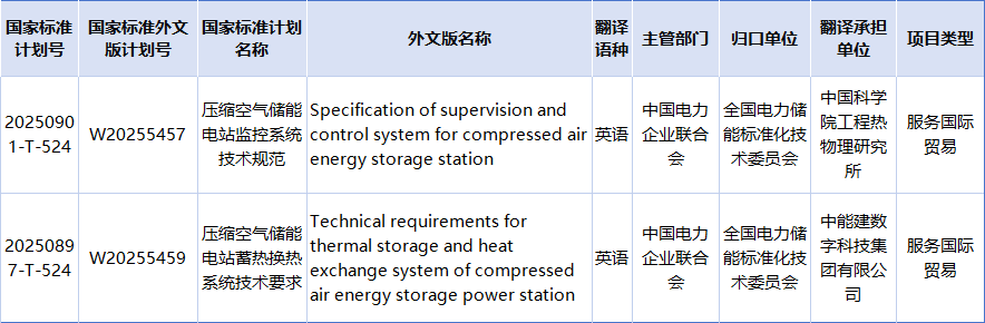 本批推薦性國家標(biāo)準(zhǔn)同步下達(dá)標(biāo)準(zhǔn)外文版計(jì)劃共計(jì)33項(xiàng),全部為英語。以上兩個(gè)壓縮空氣儲(chǔ)能相關(guān)標(biāo)準(zhǔn)均在其中。