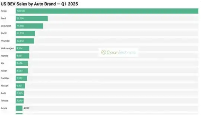 在美國市場,權(quán)威媒體Cleantechnica統(tǒng)計(jì)報(bào)道,特斯拉以累計(jì)銷量超12.8萬輛成為2025年第一季度美國純電車市場的銷冠。有海外博主據(jù)此統(tǒng)計(jì),特斯拉的銷量數(shù)據(jù)超過了細(xì)分市場其他10個(gè)品牌的總和。