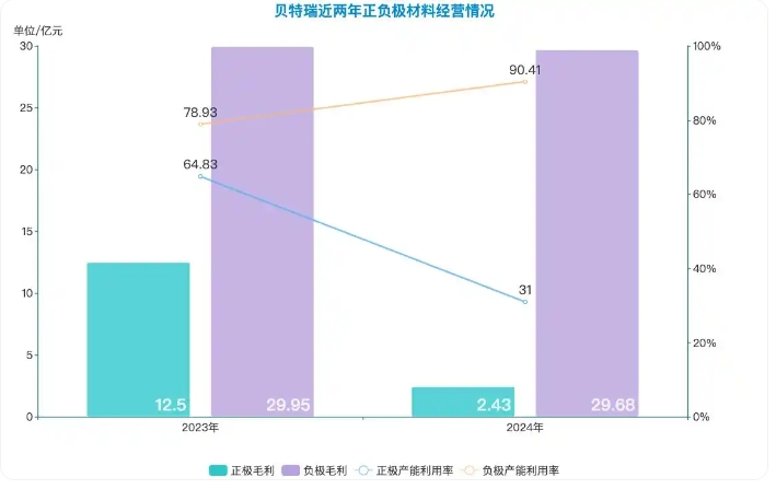 綜合來看,正極材料板塊是拖累貝特瑞業(yè)績(jī)的主因。綜合營(yíng)收與毛利率之后,負(fù)極材料方面2023年與2024年的毛利基本持平,均為29億元。但正極材料2023年?duì)I收規(guī)模更大,利率也更高,全年的毛利為12.5億元,2024年降至2.43億元,差額達(dá)到了10億元。