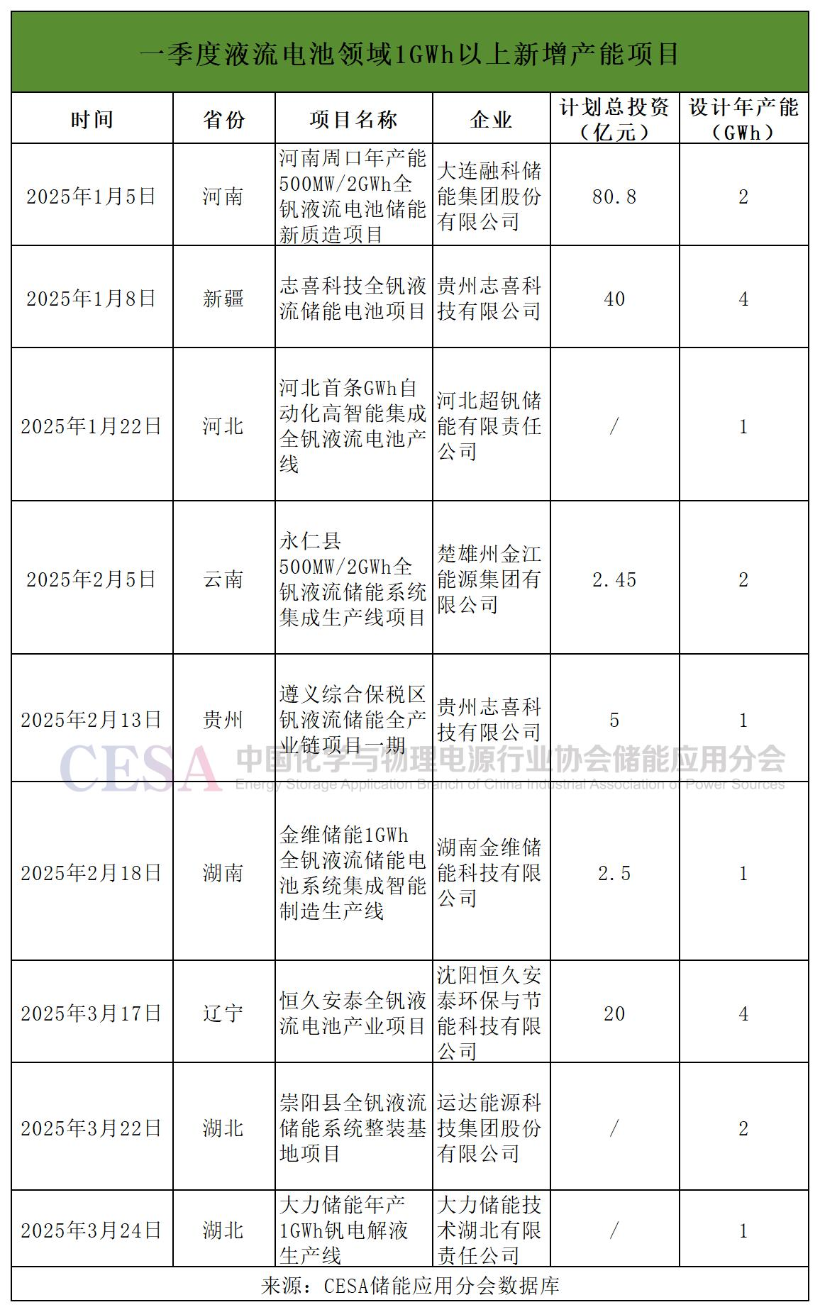 1-3月,液流電池20個新增產(chǎn)能項目中有12個明確為全釩液流電池,其中,GWh級別的共9個,包括1月份大連融科在河南周口開工液流電池全產(chǎn)業(yè)鏈綜合基地