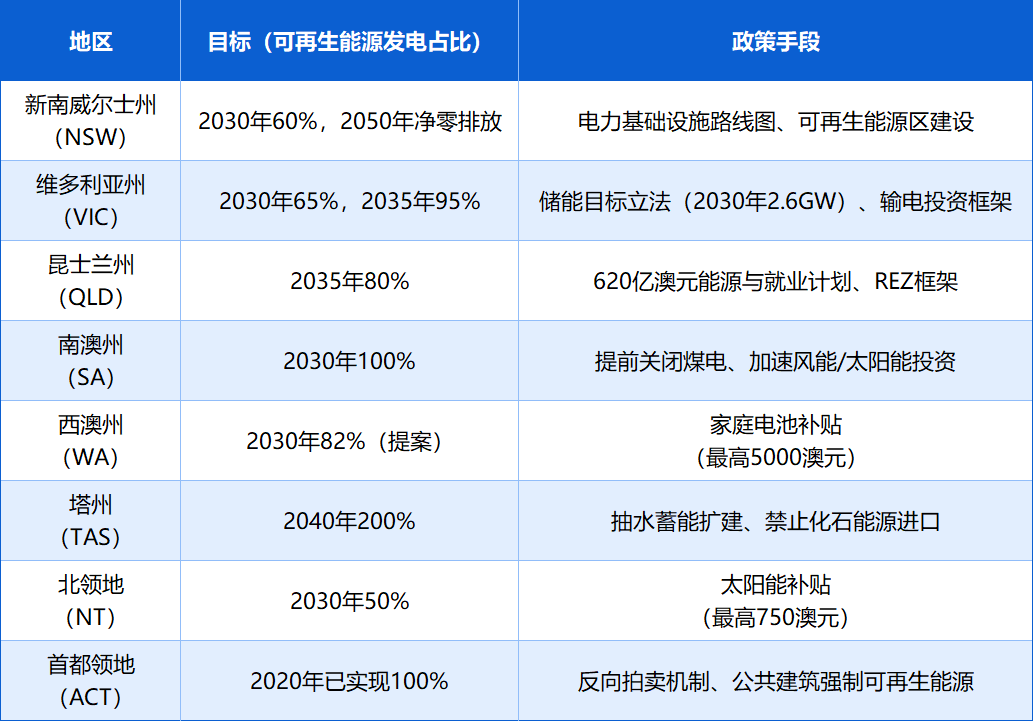 澳大利亞擁有豐富的太陽能資源,年輻照總量高達7621-8672MJ/m2,人均光伏發(fā)電量位居全球前列。聯(lián)邦“Powering Australia”計劃斥資200億澳元升級電網(wǎng);各州亦積極跟進,通過專項補貼加速清潔能源落地,如維多利亞州為電池儲能項目撥款1.19億澳元。政府政策持續(xù)加碼,計劃到2030年可再生能源發(fā)電占比達82%。