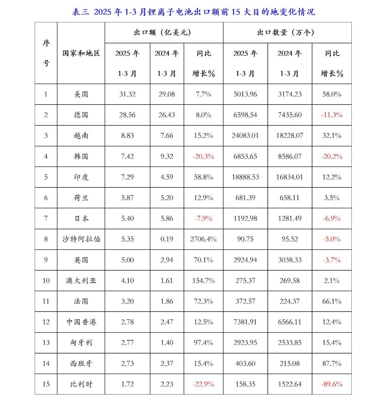美國(guó)仍是我國(guó)鋰離子電池第一大出口市場(chǎng),2025年1-3月出口美國(guó)金額為31.32億美元,同比增長(zhǎng)7.7%,占我國(guó)鋰離子出口總額的20.2%。第二大市場(chǎng)仍為德國(guó),出口金額為28.56億美元,同比增加8%,占我國(guó)鋰離子電池出口額的18.4%;越南為第三大出口市場(chǎng),出口金額為8.83億美元,同比增長(zhǎng)15.2%,占我國(guó)鋰離子電池出口額的5.7%。