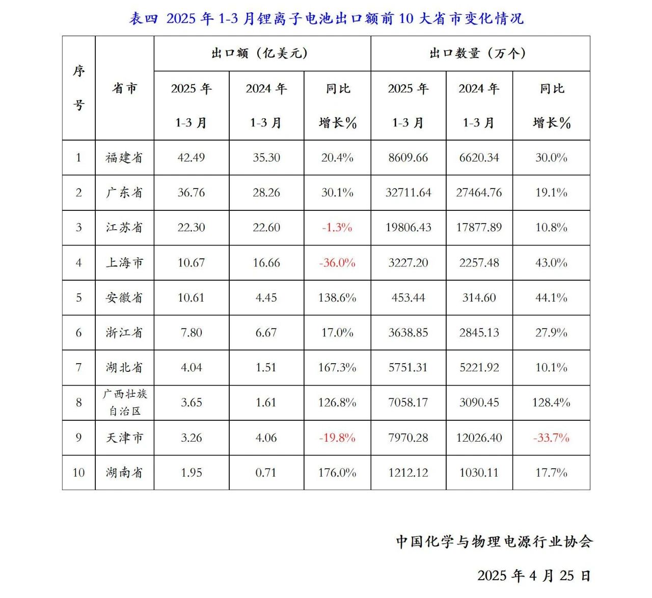 2025年1-3月福建省仍是我國(guó)鋰離子電池出口產(chǎn)品的最大來(lái)源地,出口金額為42.49億美元,同比增長(zhǎng)20.4%,占我國(guó)鋰離子電池出口額的27.4%;出口數(shù)量為8609.66萬(wàn)個(gè),同比增長(zhǎng)30%。廣東省位居第二,出口金額為36.76億美元,同比增加30.1%,占我國(guó)鋰離子電池出口額的23.7%;出口數(shù)量2.74億個(gè),同比增長(zhǎng)19.1%。江蘇省排名第三,出口額為22.3億美元,同比減少1.3%,占我國(guó)鋰離子電池出口額的14.3%;出口數(shù)量17877.89萬(wàn)個(gè),同比增長(zhǎng)43%。福建、廣東和江蘇三省的鋰離子電池出口額占到全國(guó)鋰離子電池出口額的65.5%。