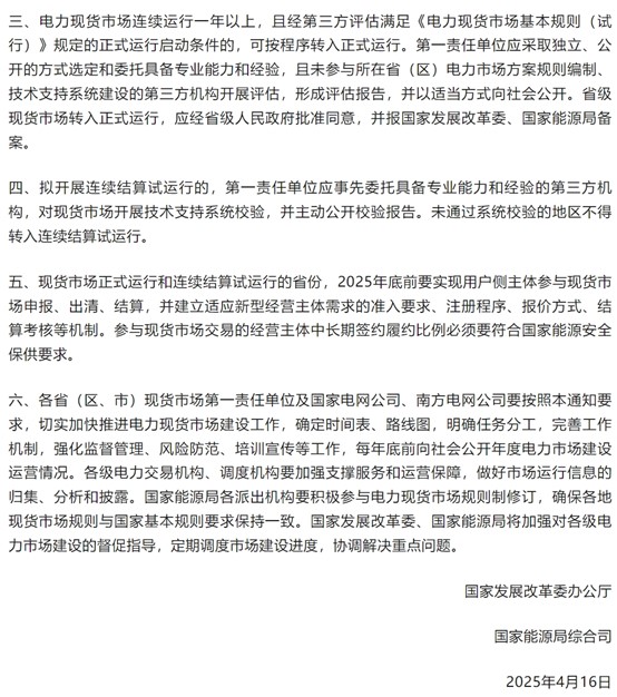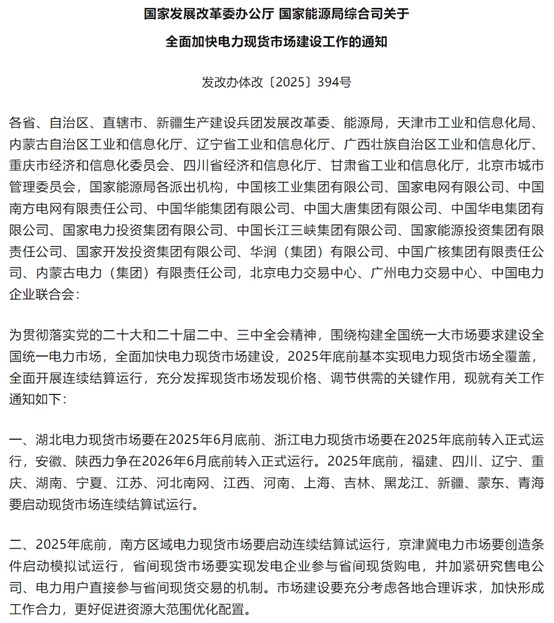 中國儲能網(wǎng)訊:4月29日,國家發(fā)改委、國家能源局聯(lián)合發(fā)布《關于全面加快電力現(xiàn)貨市場建設工作的通知》,明確2025年底前基本實現(xiàn)電力現(xiàn)貨市場全覆蓋,標志著我國電力市場化改革邁入全新階段。這份文件不僅勾勒出全國統(tǒng)一電力市場的建設路線圖,更將儲能行業(yè)推向了價值重構的十字路口。