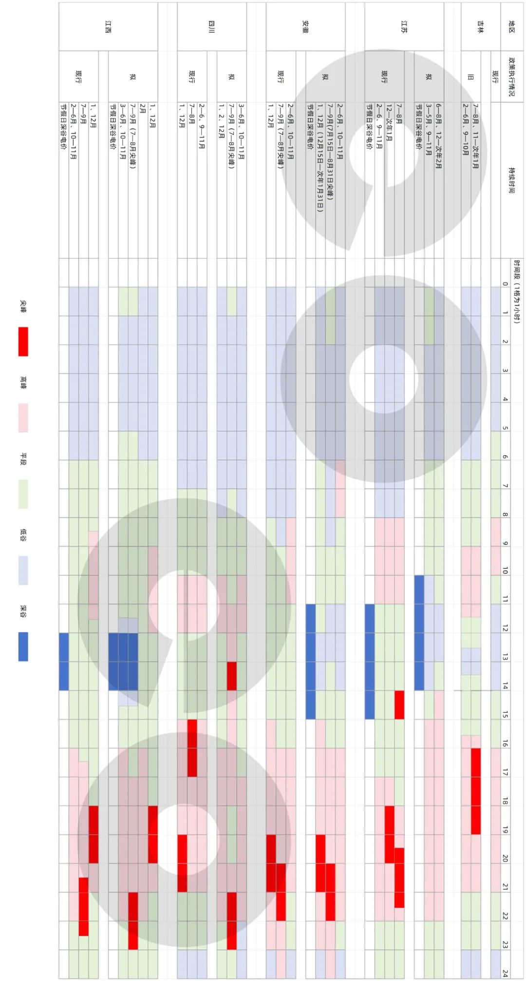 2025年2月起,吉林全年11—14點執(zhí)行午間低谷電價,較此前延長2個小時。江蘇和安徽擬全年執(zhí)行午間低谷電價,時長擬為2—4個小時,現行政策均沒有設置日間低谷電價時段。江西擬在3—11月增設午間谷時段,低谷和深谷時段分別為1個小時和2個小時,高峰、低谷、深谷電價的浮動比例均較現行擴大10個百分點。