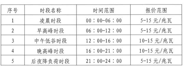 申報價格分為5個時段,分別是00:00-06:00報價范圍5-15元/兆瓦,06:00-12:00報價范圍為5-15元/兆瓦,12:00-16:00報價范圍為10-15元/兆瓦,16:00-21:00報價范圍為10-15元/兆瓦,21:00-24:00報價范圍為5-15元/兆瓦。