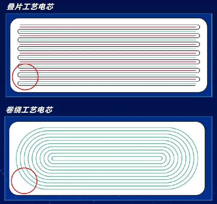 與眾多廠商不同的是,南都電源從20年前便選擇了鋰電疊片工藝,而不是常規(guī)的卷繞工藝,就是基于對(duì)電池安全性和循環(huán)壽命的考量。疊片工藝相較卷繞工藝實(shí)現(xiàn)了更高的能量密度,同時(shí)極片膨脹收縮時(shí)保持平整,內(nèi)部應(yīng)力分布均勻,不存在弧形拐角處的應(yīng)力集中問題,使用更安全。