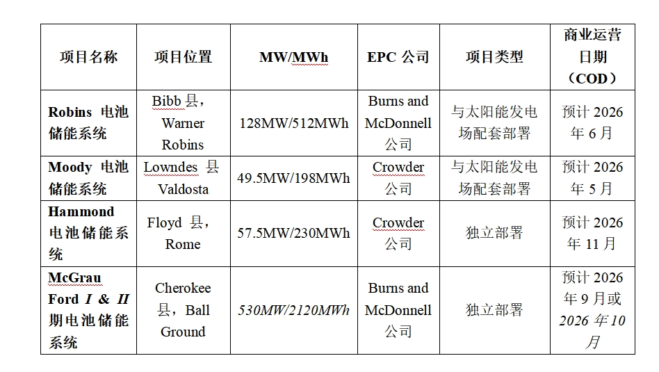佐治亞州電力公司計(jì)劃部署的電池儲(chǔ)能項(xiàng)的詳細(xì)信息如下表所示: