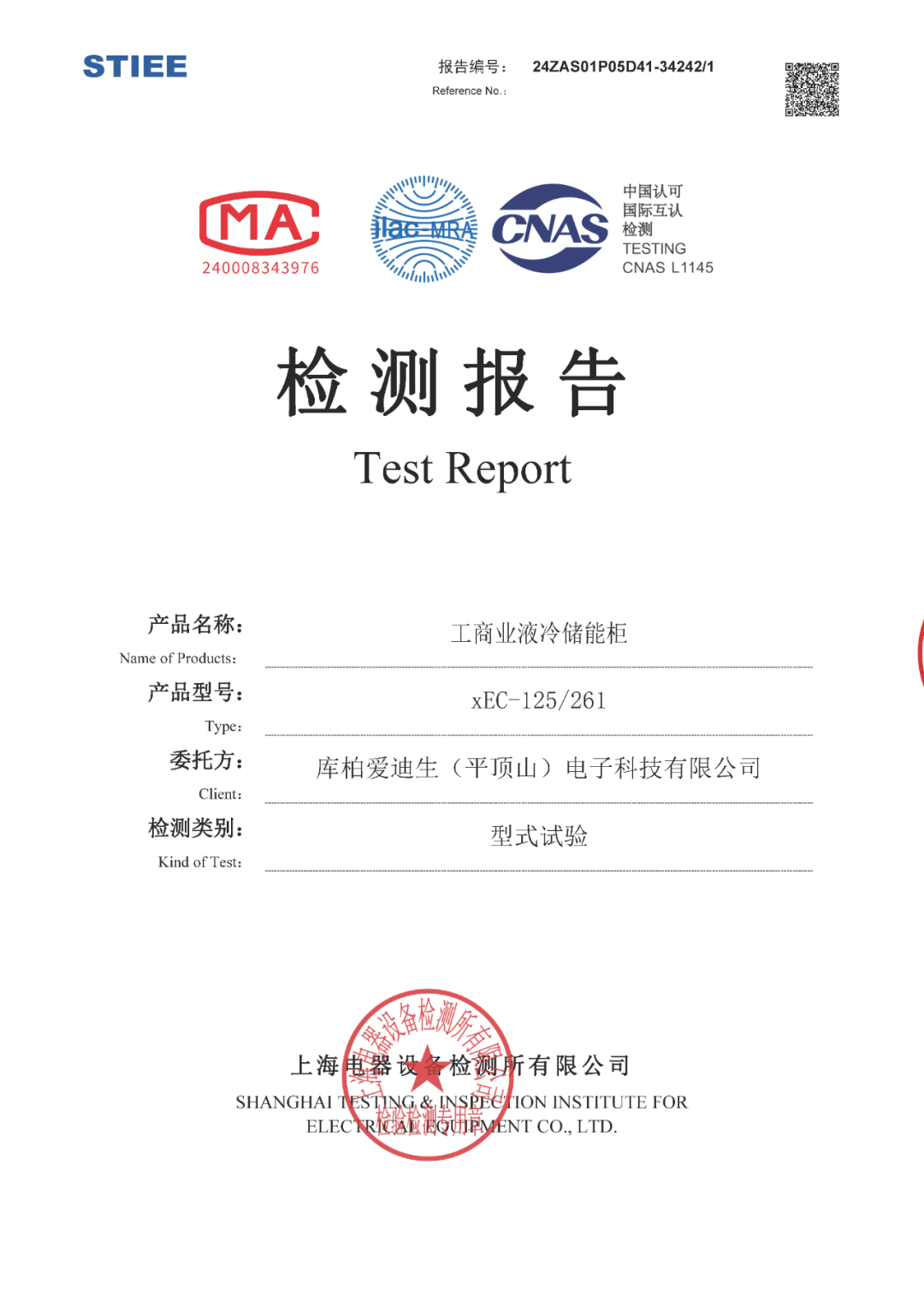 中國儲能網(wǎng)訊:近日,伊頓 xEnergyCubo 工商業(yè)液冷儲能系統(tǒng)在上海電器設(shè)備檢測所有限公司(以下簡稱:STIEE)成功通過儲能系統(tǒng)新國標(biāo)檢測認(rèn)證。這是 STIEE 自 GB/T 44026-2024《預(yù)制艙式鋰離子電池儲能系統(tǒng)技術(shù)規(guī)范》新國標(biāo)實(shí)施以來,出具的第一份型式試驗(yàn)報(bào)告。