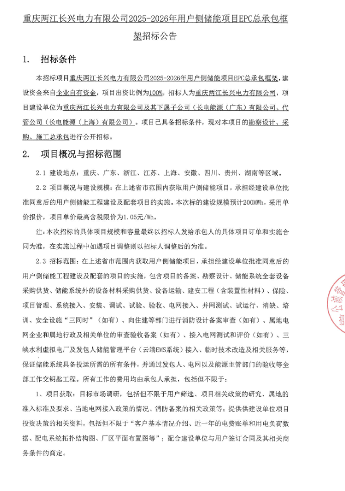 中國(guó)儲(chǔ)能網(wǎng)訊:5月14日,重慶兩江長(zhǎng)興電力有限公司2025-2026年用戶側(cè)儲(chǔ)能項(xiàng)目EPC總承包框架招標(biāo)公告發(fā)布。