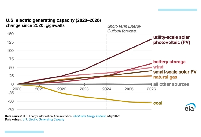 預(yù)計的電力需求增長正在推動發(fā)電能力和電力儲存的擴(kuò)張。新增發(fā)電能力大多來自太陽能和電池儲能設(shè)施。新增發(fā)電能力集中在德克薩斯州、加利福尼亞州、中西部上游和東北部地區(qū)。