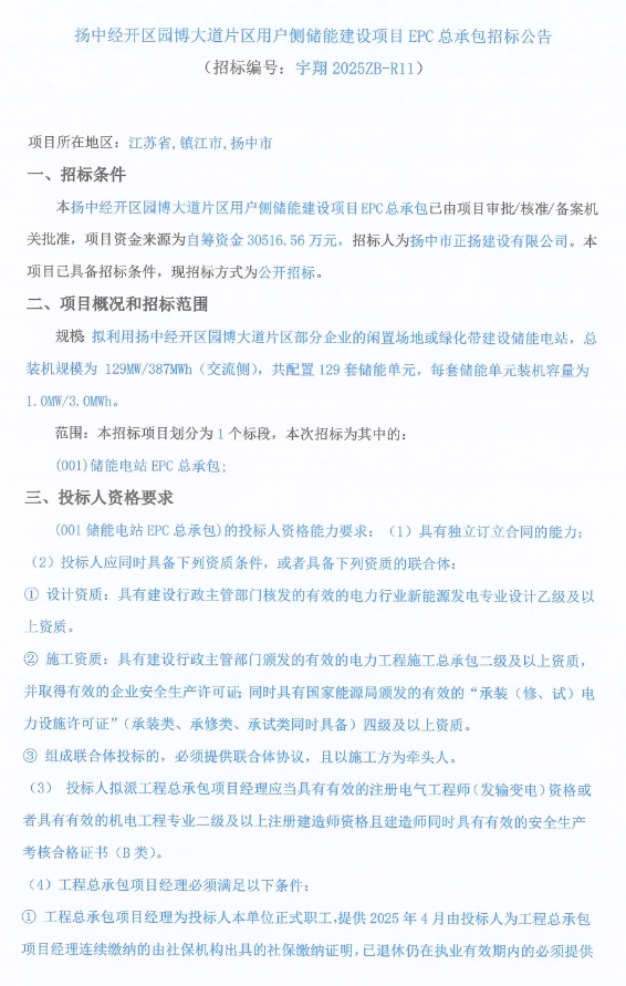 中國(guó)儲(chǔ)能網(wǎng)訊:5月16日,揚(yáng)中市正揚(yáng)建設(shè)有限公司發(fā)布了揚(yáng)中經(jīng)開(kāi)區(qū)園博大道片區(qū)用戶(hù)側(cè)儲(chǔ)能建設(shè)項(xiàng)目EPC總承包招標(biāo)公告,項(xiàng)目位于江蘇省鎮(zhèn)江市揚(yáng)中市,擬利用揚(yáng)中經(jīng)開(kāi)區(qū)園博大道片區(qū)部分企業(yè)的閑置場(chǎng)地或綠化帶建設(shè)儲(chǔ)能電站,總裝機(jī)規(guī)模為 129MW/387MWh(交流側(cè)),共配置 129 套儲(chǔ)能單元,每套儲(chǔ)能單元裝機(jī)容量為1MW/3MWh。