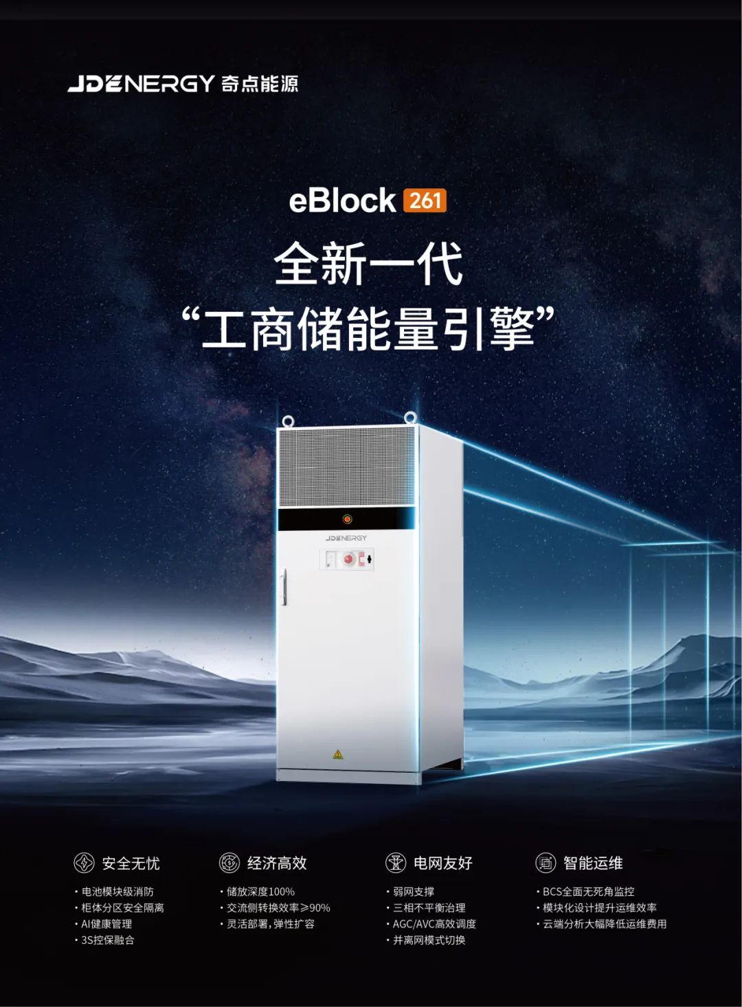 同時,為了提升儲能收益,轉換效率成為衡量系統性能優(yōu)劣的直接而關鍵的指標。奇點能源的最新儲能系統產品eBlock-261 ,已然成為了“第一臺支持電力現貨可自進化的儲能產品”,其系統轉換效率超91%、高于行業(yè)平均水平,且兼具高能量密度、占地小、多重安全防護等優(yōu)勢,可廣泛應用于工商業(yè)削峰填谷、虛擬電廠、備用電源及三相不平衡治理等多種場景,被譽為“工商儲能量引擎”。