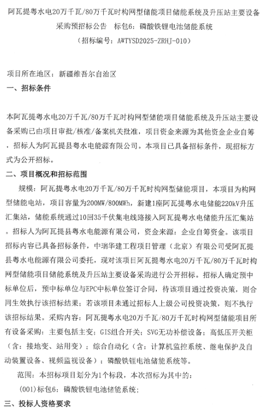 中國(guó)儲(chǔ)能網(wǎng)訊:5月20日,阿瓦提粵水電200MW/800MWh構(gòu)網(wǎng)型儲(chǔ)能項(xiàng)目?jī)?chǔ)能系統(tǒng)及升壓站主要設(shè)備 標(biāo)包6:磷酸鐵鋰電池儲(chǔ)能系統(tǒng)采購(gòu)預(yù)招標(biāo)發(fā)布,項(xiàng)目位于新疆維吾爾自治區(qū)。