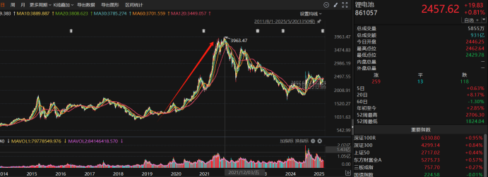 遙想2019年至2021年年底那波瘋狂的“鋰電池”行情,記憶猶新的就是碳酸鋰的價格一度走高至接近60萬/噸的天價,彼時僅國產(chǎn)新能源汽車爆發(fā)后的市場預期,就帶動了整個鋰電池產(chǎn)業(yè)鏈各種原材料價格的走高,比如當時有“新液體黃金”的六氟磷酸鋰在供給剛性的背景下,迎來價格上漲周期,半年時間從8萬元/噸快速上漲至40萬元以上,漲幅超過400%,最高曾突破60萬/噸。原材料上市公司受到“戴維斯雙擊”的利好影響,疊加機構抱團,當年造就了一大批千億級別的上市公司。