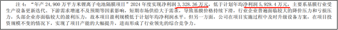 公司的隔膜基膜因設備也同樣遭到?jīng)_擊,隨著國產(chǎn)化加速,新進入者涌入市場,價格持續(xù)下挫。2024年公司的基膜項目“年產(chǎn)24900萬平方米鋰離子電池隔膜項目”,全年僅實現(xiàn)效益3328.36萬元,遠低于預期的5929.4萬元。
