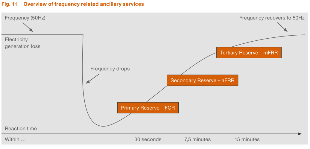 自動頻率恢復儲備(aFRR)-分鐘級恢復標稱頻率(二次調(diào)頻),參與每日拍賣。穩(wěn)定收益流,拍賣競價模式。