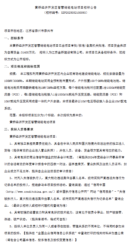 中國儲能網(wǎng)訊:5月21日,江蘇省泰州市泰興市黃橋經(jīng)濟開發(fā)區(qū)100MW/300MWh智慧儲能電站項目招標(biāo)公告發(fā)布。招標(biāo)人為江蘇金橋建設(shè)有限公司,項目資金來源為自籌資金31400萬元,折合單價約1.05元/Wh。