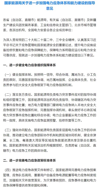 中國儲能網(wǎng)訊:在“雙碳”目標(biāo)與能源革命的浪潮中,中國儲能產(chǎn)業(yè)正迎來黃金發(fā)展期。5月20日,國家能源局重磅發(fā)布《關(guān)于進(jìn)一步加強(qiáng)電力應(yīng)急體系和能力建設(shè)的指導(dǎo)意見》,為儲能技術(shù)的大規(guī)模商業(yè)化應(yīng)用按下加速鍵。這份文件不僅勾勒出電力應(yīng)急體系建設(shè)的清晰路徑,更從政策扶持、標(biāo)準(zhǔn)制定、技術(shù)創(chuàng)新、市場培育等多方面,為儲能產(chǎn)業(yè)鋪就了一條高速發(fā)展的新賽道。