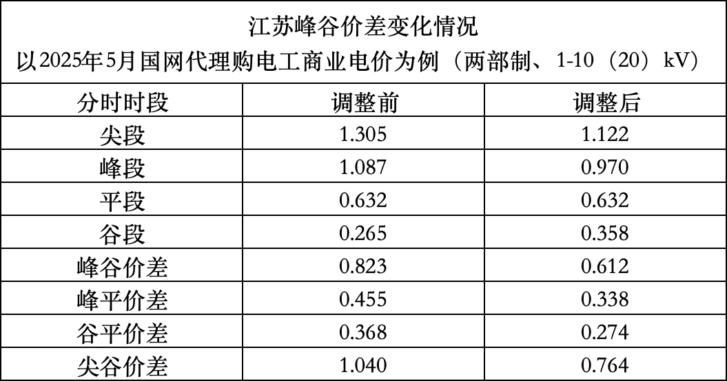 以2025年5月江蘇省1-10(20)kV代理購電工商業(yè)用戶電價為例,新政實(shí)施后,峰谷價差從調(diào)整前的0.8225元/kWh降至0.6122元/kWh,降幅高達(dá)25.57%。