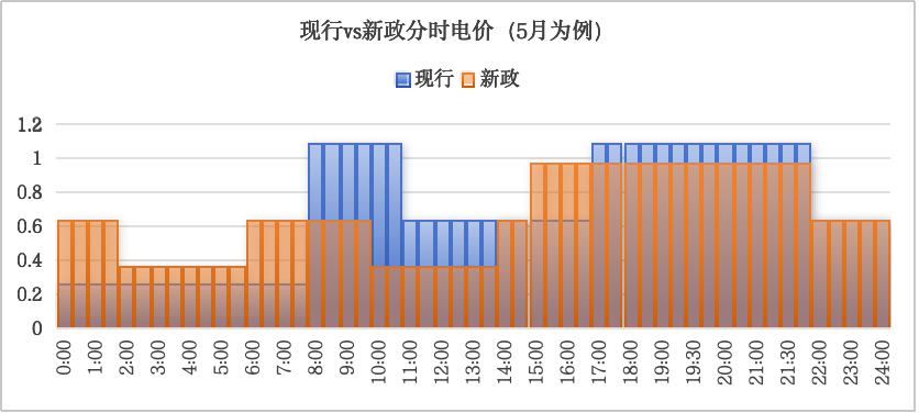 電價分時最大的調(diào)整主要來自于上午的峰值電價變?yōu)槠街惦妰r,中午的平值電價變?yōu)楣戎惦妰r,明顯降低了白天工作時段整體電價水平。