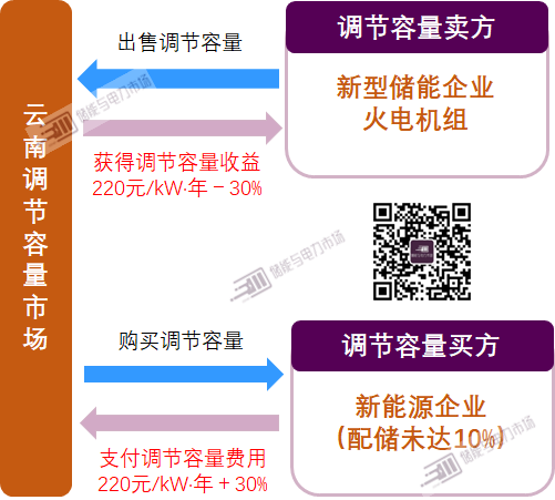 兩份文件均要求實(shí)行“新能源+儲(chǔ)能”機(jī)制,集中式風(fēng)電和光伏發(fā)電項(xiàng)目(含已建成項(xiàng)目)需按不低于裝機(jī)容量10%的比例(持續(xù)時(shí)長不低于2小時(shí))配置儲(chǔ)能容量,或購買系統(tǒng)調(diào)節(jié)服務(wù)。而云南省的調(diào)節(jié)容量市場也在這兩份文件的條款規(guī)定下,逐漸確定。下圖為相關(guān)機(jī)制的簡單描述。