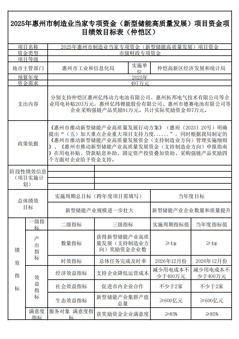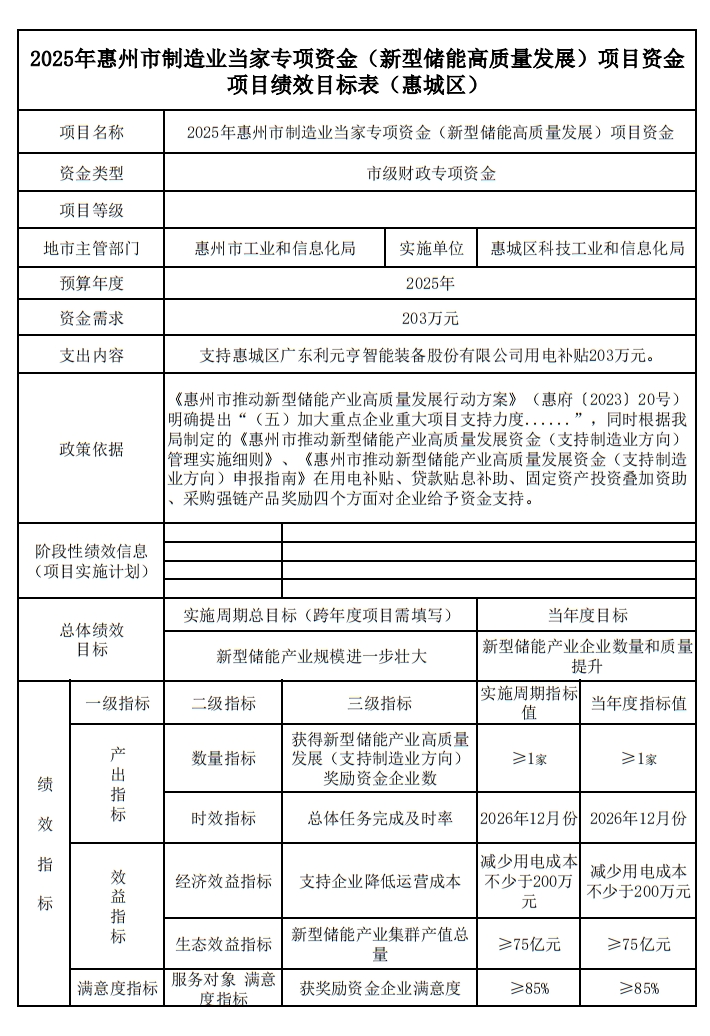 2.2025年惠州市制造業(yè)當家專項資金(新型儲能高質量發(fā)展)績效目標表(惠城區(qū)、仲愷區(qū))