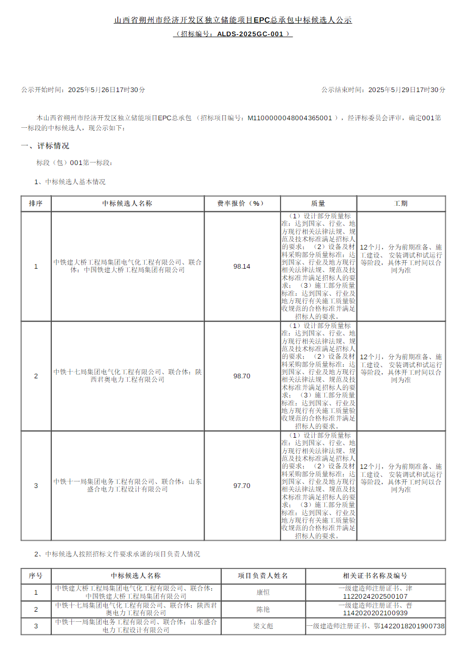 中國(guó)儲(chǔ)能網(wǎng)訊:5月26日,山西省朔州市經(jīng)濟(jì)開(kāi)發(fā)區(qū)獨(dú)立儲(chǔ)能項(xiàng)目EPC總承包中標(biāo)候選人公示。