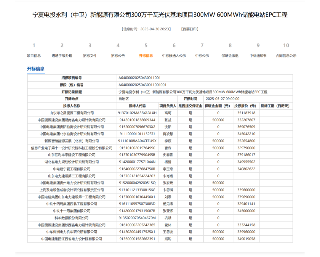 中國(guó)儲(chǔ)能網(wǎng)訊:5月27日,寧夏電投永利(中衛(wèi))新能源有限公司300萬(wàn)千瓦光伏基地項(xiàng)目300MW/600MWh儲(chǔ)能電站EPC工程項(xiàng)目開(kāi)標(biāo)。