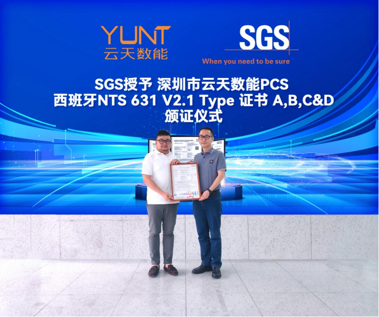 SGS為云天數(shù)字能源儲(chǔ)能并網(wǎng)逆變器頒發(fā)西班牙并網(wǎng)系列證書