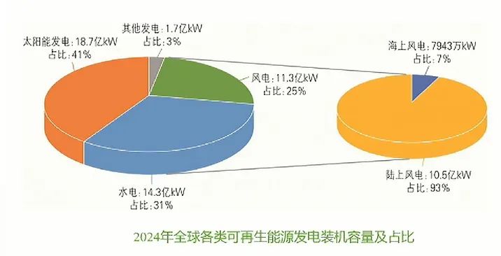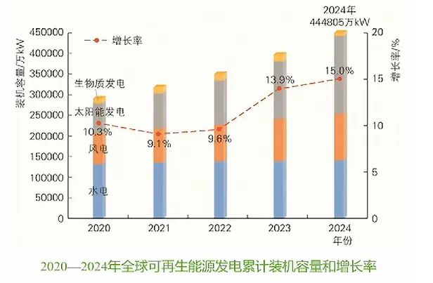 2024年,全球新增可再生能源發(fā)電裝機約5.9億kW, 占全球電力行業(yè)新增裝機容量的94%;