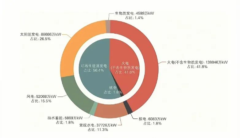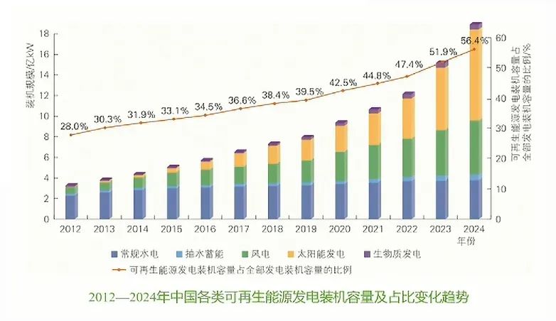 截至2024年底,國內(nèi)可再生能源總裝機達到18.9億kW, 占全部發(fā)電裝機的56.4%,進一步鞏固了在電力裝機中的主體地位。