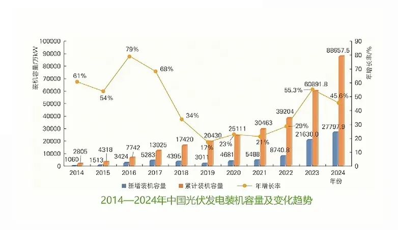 截止2024年底,國內(nèi)太陽能累計裝機8.9億kW, 同比增長45%,占全國電力總裝機的26%。其中,