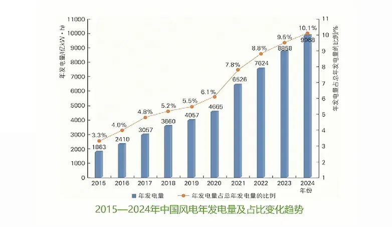 2024年,風電全年發(fā)電量9968億kWh,同比增長12.5%,占全部電源年總發(fā)電量的10.1%,同比提高0.6個百分點。