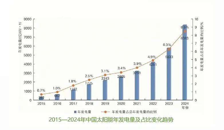 2024年,全國太陽能發(fā)電全年發(fā)電量8383億kWh,同比增長43.7%,占全部電源年總發(fā)電量的8.5%,同比提高2.2個百分點。