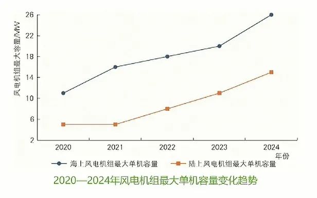 1)單機容量大幅提升。 陸上風電項目10MW 機組批量應用,15MW 機組成功吊裝;海上風電首臺18MW 機組并網(wǎng)發(fā)電。