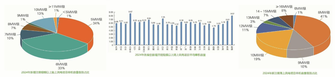 海上風電項目中,8MW-10MW級風電機組占比70%,且以8MW級為主,超過16MW占比僅2024年各省份新增注冊規(guī)模以上陸上風電項目平均單機容量8%,最大單機規(guī)模(擬建)為18MW。
