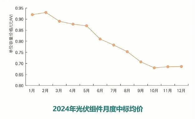受技術(shù)進步、規(guī)?;a(chǎn)、原材料價格下跌、產(chǎn)業(yè)鏈供需關(guān)系 等因素影響,2024年前三季度光伏組件中標價格呈現(xiàn)快速下滑 的趨勢,10月后有所企穩(wěn),四季度均價0.69元/W。